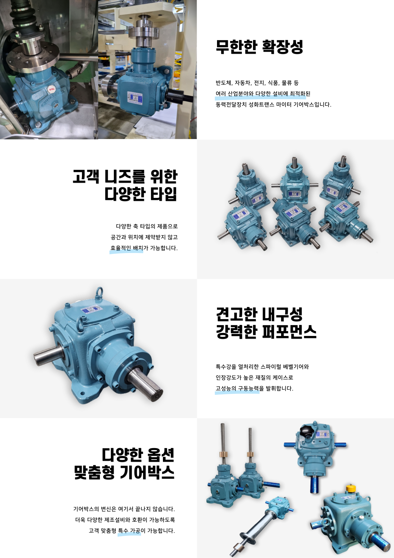기본형(A), 감속형(B), 증속형(W)으로 생산이 가능하며 고객 주문사양에 맞추어 특수 기어박스 설계 및 제작을 수행하고 있습니다.
