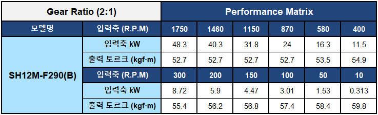 SH12M F290(B) | 입력축 kW | 48.3 | 40.3 | 31.8 | 24 | 16.3 | 11.5 | 8.72 | 5.9 | 4.47 | 3.01 | 1.53 | 0.313 |