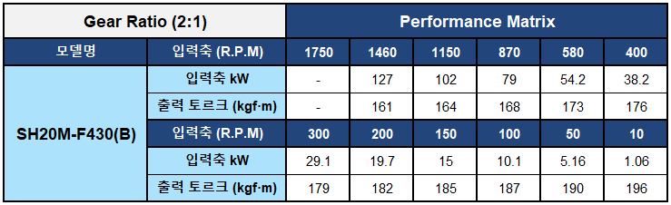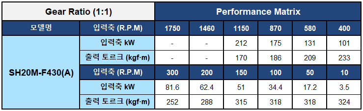 SH20M F430(A) | 입력축 kW | - | - | 212 | 175 | 131 | 101 | 81.6 | 62.4 | 51 | 34.4 | 17.2 | 3.5 |